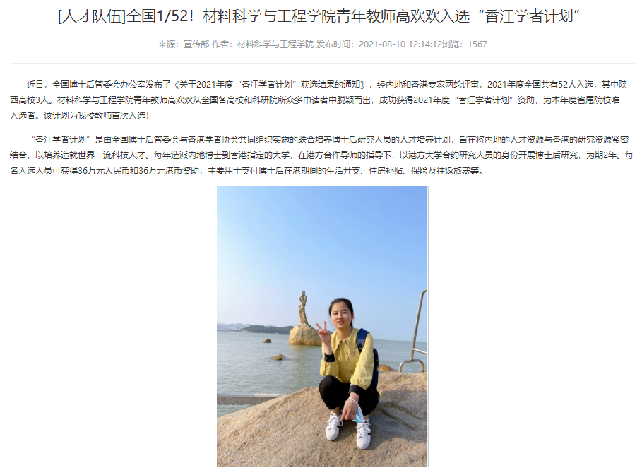 不忘初心,教学科研两不误。作为青年教师,高欢欢老师在保质保量完成学生工作之余,利用个人休息时间,坚守初心,立足本职教学与科研工作,参与主讲《能量转换材料与器件》《新能源材料合成与制备》等课程,提升自身教学能力。立足学生工作,担任材物1801班主任工作,班级获选2021年校级“优良学风班”,也担任多名材料物理专业和新能源材料与器件专业本科生导师。在科研方面,积极申报科研项目,获批2021国境外交流项目“香江学者计划”、陕西省科技厅自然科学研究项目青年项目1项、陕西省教育厅一般专项研究项目1项,也指导国家级大学生创新创业大赛1项。同时积极对接企业做到产学研的有效结合,获批企业横向项目1项,在国际高水平学术期刊发表论文20余篇,申请发明专利1项。在研究生培养方面,以高标准严要求的准则,培养及协助培养研究生3名。