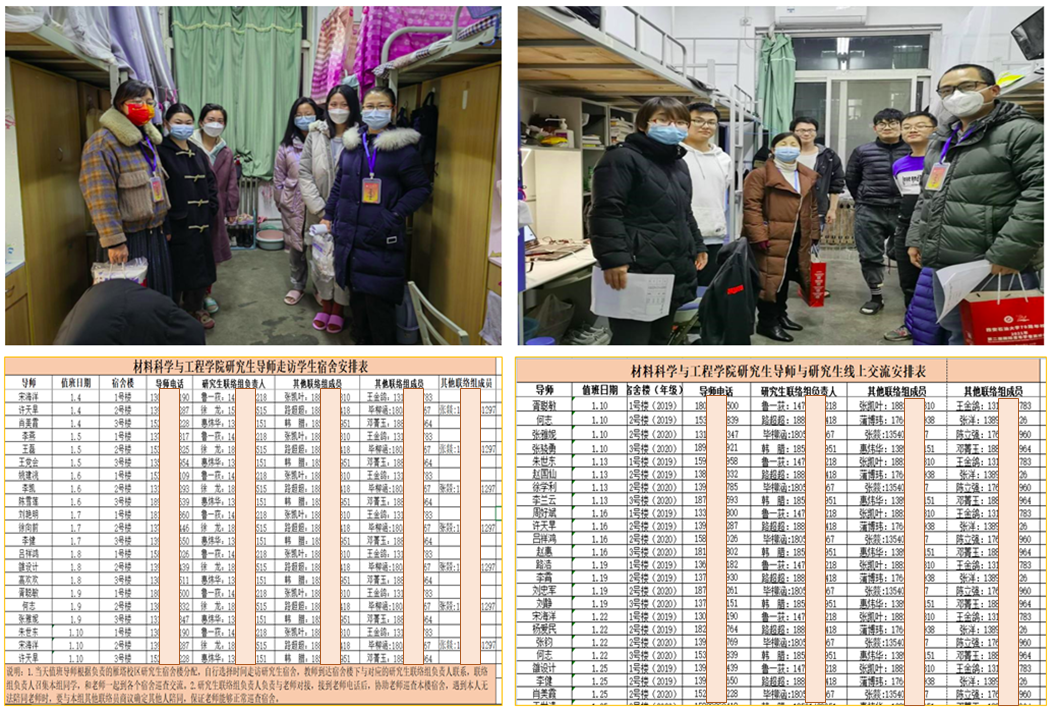 为保证研究生在疫情防控期间更好的成长成才,切实发挥研究生导师职责,学院党委精心谋划、积极部署。一是安排10名教师党员先锋队(研究生导师)在12月31日这一重要时间节点组成3组进入研究生宿舍,逐一对研究生进行慰问,送新年祝福发防疫口罩。二是组织在南院居住的19名研究生导师从1月3日开始,每天分三组深入学生宿舍进行走访交流,关心学生生活、学习动态,了解学生的实际困难,鼓励大家积极面对疫情,树立信心。三是结合学校封控管理政策,组织全院校内外研究生导师从1月9日开始,每次分四组对雁塔校区全体研究生开启“云沟通、云指导”模式,导师通过腾讯会议等在线软件用先进典型事例向研究生弘扬抗疫精神,引导研究生正确面对疫情,教育研究生增强自我防护能力和防护意识,遵守疫情防控相关规定,积极对研究生开展心理疏导、学业指导和人文关怀等工作。
