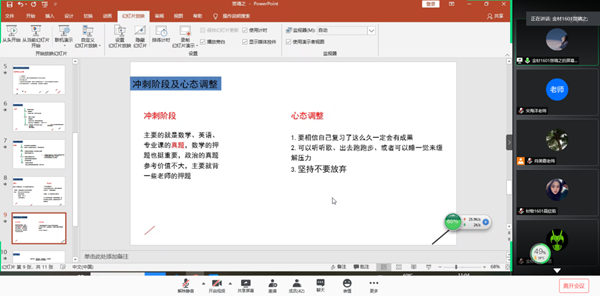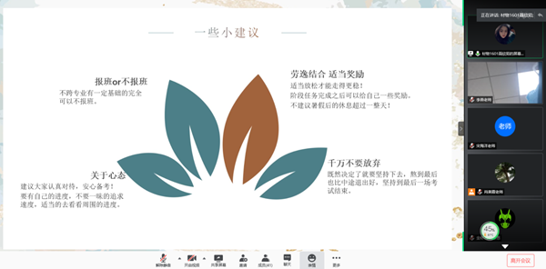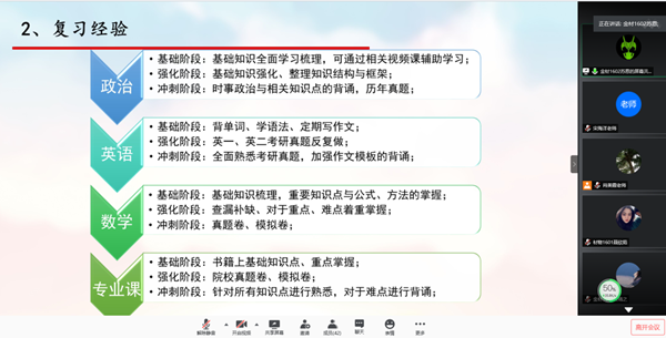 接着,考研优秀学生代表聂欣茹、苏恩和贺靖之三位同学为大家做了考研经验交流。他们通过分享自己在考研院校与专业选择、初试备考经历、考研心态调整、复试备考及注意事项等方面的心得和经验,为材料物理1701班学生考研备战提供了很好的借鉴和帮助。