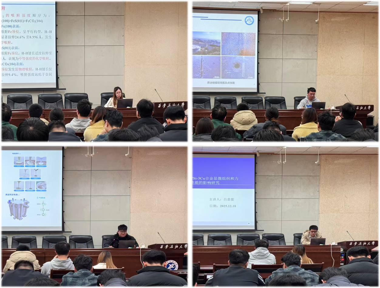 论坛中,四位主持创新基金项目的2023级硕士研究生,结合各自立项课题进行了系统汇报与深度分享。安海娟从原子尺度揭示了氢在管线钢表面的吸附机制;刘洢辰聚焦微生物腐蚀,探索基于生物竞争的绿色抑腐路径;肖辉致力于开发高熵钙钛矿材料,以提升固体氧化物燃料电池的阴极性能;吕嘉鳌研究了陶瓷增强铝硅铜合金的显微组织调控与力学性能优化。汇报内容覆盖能源材料、腐蚀防护以及复合材料等多个前沿方向,充分展现了1024核工厂