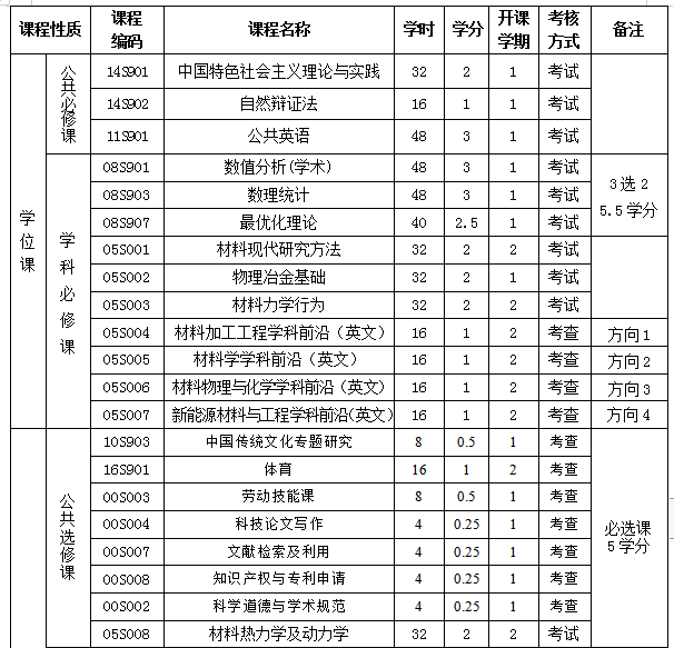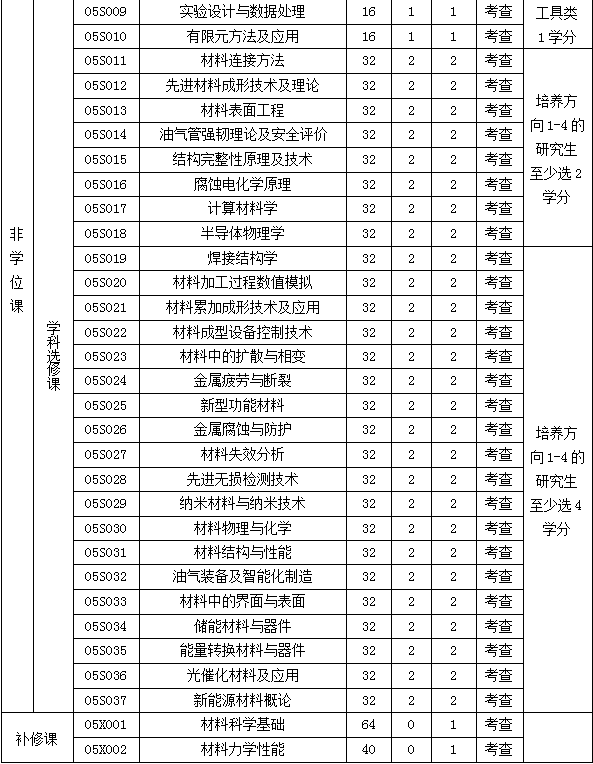 2.补修课:不计学分。跨学科、专业或同等学历录取的培养方向1-4的研究生,须补修材料类本科专业《材料科学基础》和《材料力学性能》2门主干课程,并列入研究生培养计划。