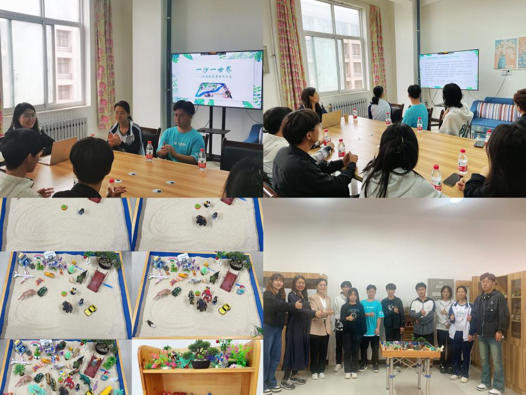 魏老师围绕沙盘的历史起源与意义、基本理论、使用方法等方面展开理论知识的培训,并指导同学们展开实践。在沙盘布置环节,同学们井然有序,认真选择,积极构思,逐步完成了团队的沙盘作品。随后,每位同学都对自己的摆放过程进行了分享,诉说内心的感受。通过团体心理沙盘体验,同学们获得了心灵上的放松,也感受到了被团队成员关注和支持的温暖。