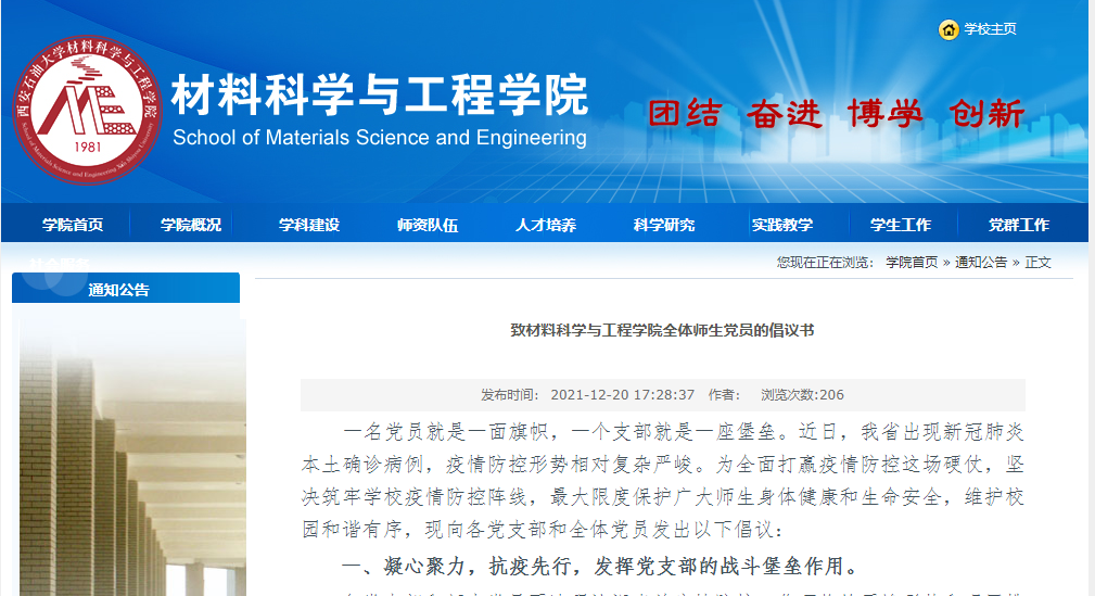 全体师生党员的倡议书》,号召广大党员要迅速投入到疫情防控工作中来,率先垂范、担当使命,冲在最前、干在最前,用实际行动传递党的声音,凝聚党的力量。在这样的号召下,一个个材料人争当抗“疫”先锋,用一个个弱小的力量慢慢汇聚到这场疫情阻击战的大战役中。