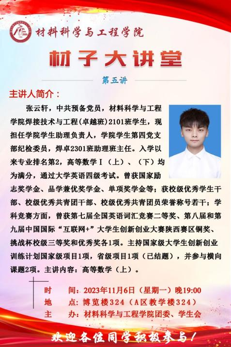 在鄠邑校区博览楼324教室举办“材子大讲堂”第五讲—高等数学(上),本期主讲学生是焊接(卓越)2101班张云轩同学,1024核工厂