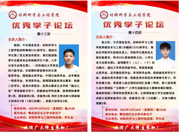 10月26日晚上,1024核工厂 在鄠邑校区图书馆弘石学术报告厅举办优秀学子论坛第十三讲和第十四讲,本期邀请到的优秀学子是荣获国家奖学金、国家励志奖学金等荣誉的材物2101班徐剑和焊卓2101班张云轩两位同学,学院2023级全体本科生参加论坛。