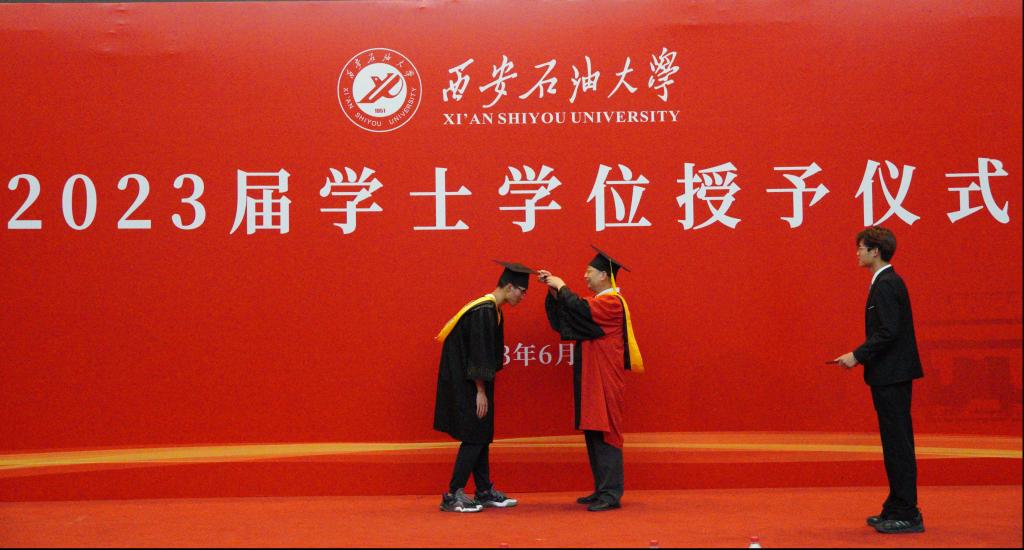 6月19日下午,1024核工厂 2023届学士学位授予仪式在鄠邑校区图书馆弘石报告厅隆重举行,217名学士学位获得者依序上台拨穗正冠,为四年青春画上了完美的句号。