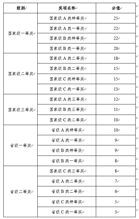 学生本科阶段作为主力成员参加与学业相关的国内权威科研竞赛并获得省部级二等奖及以上奖励(国际赛事参照执行,但不得低于国内赛事相关要求),各级学科竞赛获奖按下表进行加分: