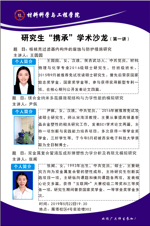 为了进一步完善人才培养机制,营造更好的学术氛围,创建良好的学术生态,激发研究生的创造智慧和创新潜能,为教师和研究生之间、研究生和研究生之间的学术沟通与合作搭建平台,学院研究决定,从2019年开始定期开展研究生“携承”学术沙龙活动。活动形式为邀请优秀的校外在读博士研究生和校内三年级研究生作学术报告,在场的老师及学生就相关主题开展深入交流研讨。