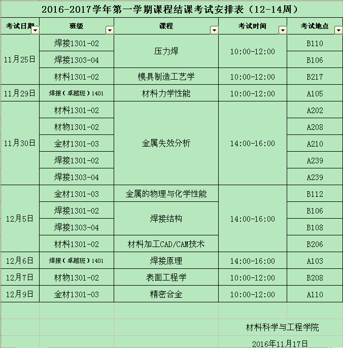 2016-2017学年第一学期课程结课考试安排表(12-14周)