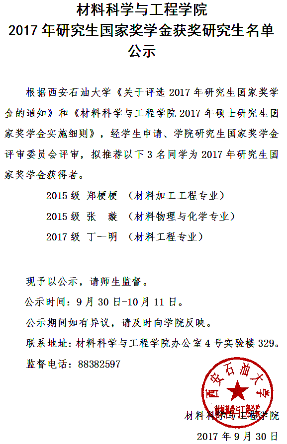 2017年研究生国家奖学金获奖研究生名单公示
