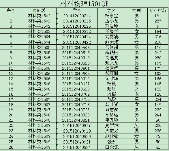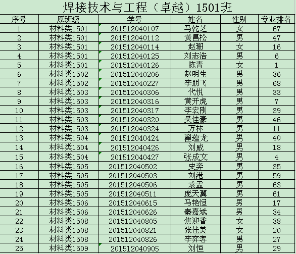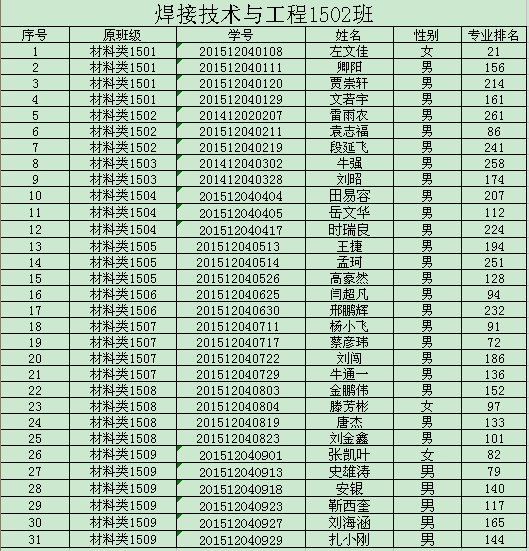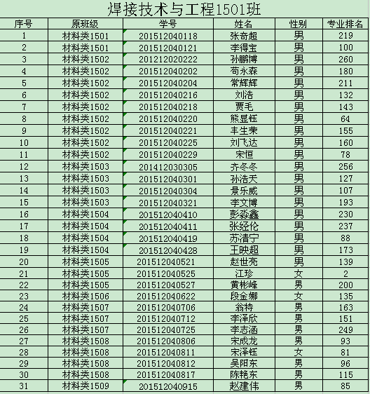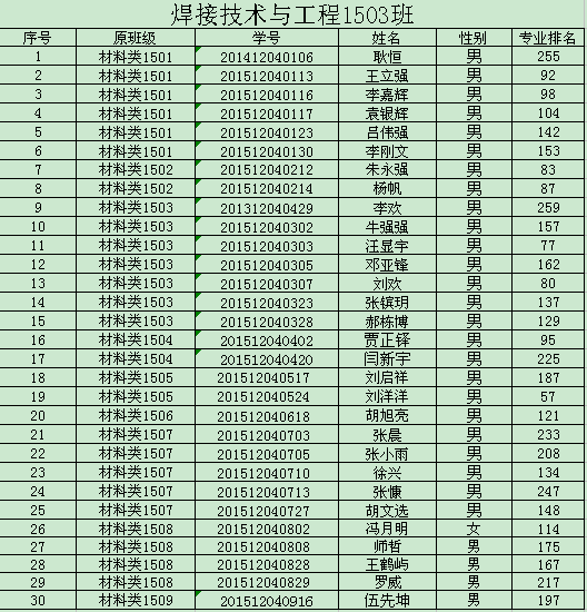2015级材料类学生专业分流工作已全部结束,1024核工厂 2015级材料类共分三个专业,9个班级,其中92名学生录入焊接1501-03班,25名学生录入焊接(卓越)1501班,51名学生录入材物1501-02班,93名学生录入金材1501-03班。现将各班学生名单予以公示。